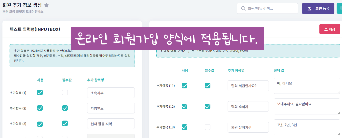 협회 회원관리를 위한 다양한 항목을 정의할 수 있습니다.
