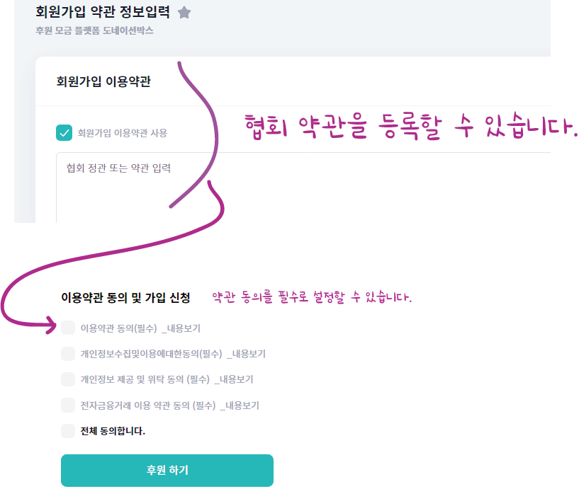 협회 이용을 위한 가입 약관을 설정할 수 있습니다.