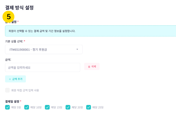 5. 결제 방식과 금액을 설정합니다.