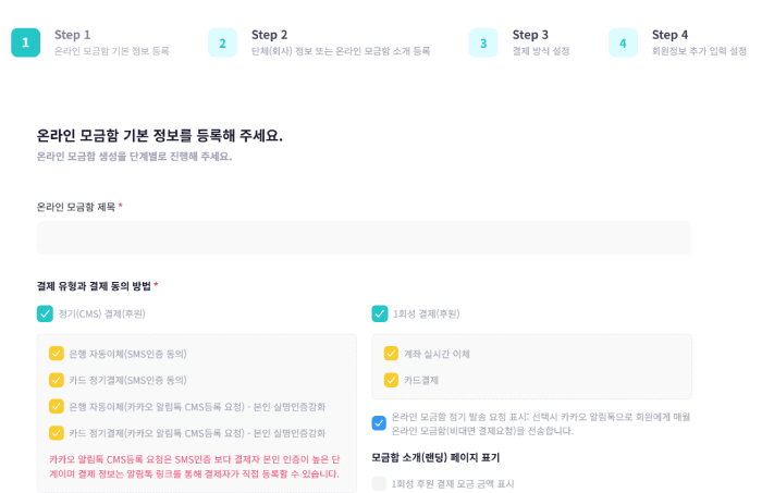 3. 모금함을 구성하는 결제, 회원등록 방식등 기본정보를 선택합니다.