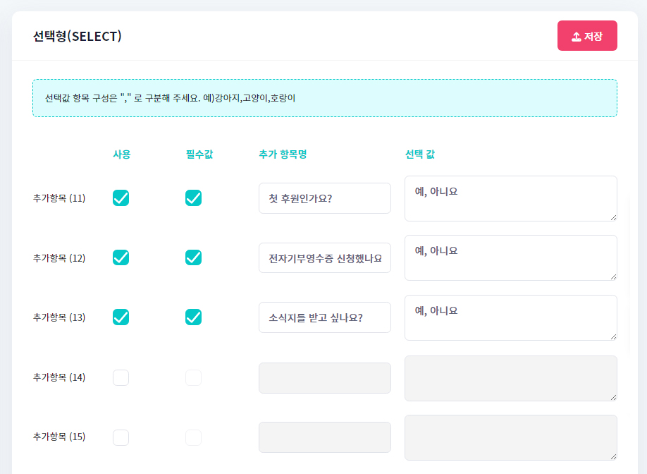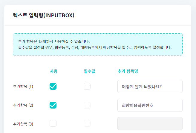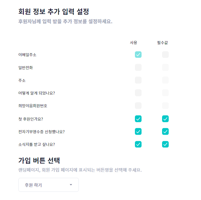 3. 온라인 모금함에 노출할 회원등록 항목을 선택하며, 필수 값 여부도 결정합니다.