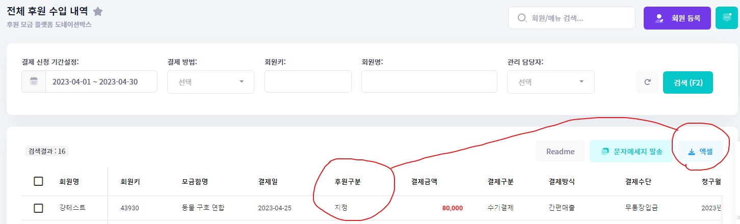 전체 후원수입, 회원정보, 문자보내기 등 확인하는 데이터에 내가 직접 생성한 항목이 반영된것을 확인할 수 있으며 엑셀로 다운받을 수 있습니다.