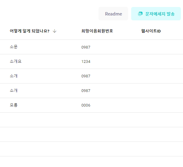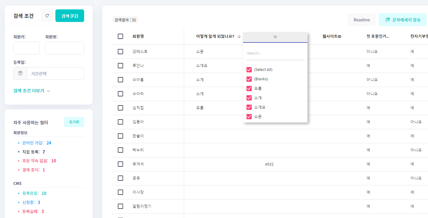 회원 등록 정보가 그리드에 추가 되어 검색과 필터, 정렬까지 가능하게 완성됩니다. 잘 구성된 회원 등록 항목을 바탕으로 단체 문자보내기에 활용할 수 있습니다.