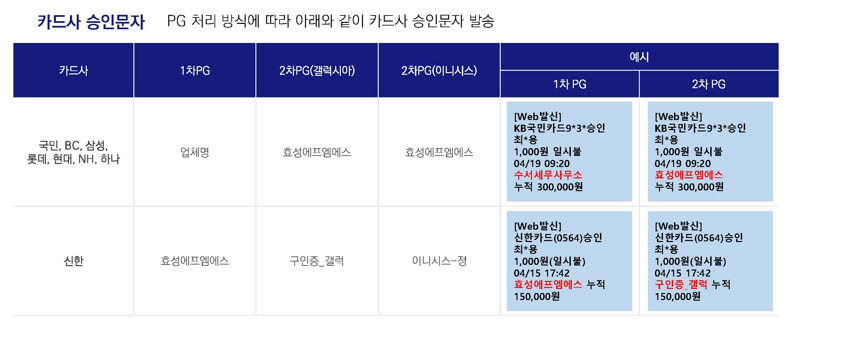 실제 카드 결제 승인 문자에는 효성에프엠에스, 갤럭시아머니트리, 이니시스 등으로 전송되며 결제대행사에서 후원자에게 카드 결제 내역에 대한 후원 기관정보를 추가 문자로 발송하게 됩니다.