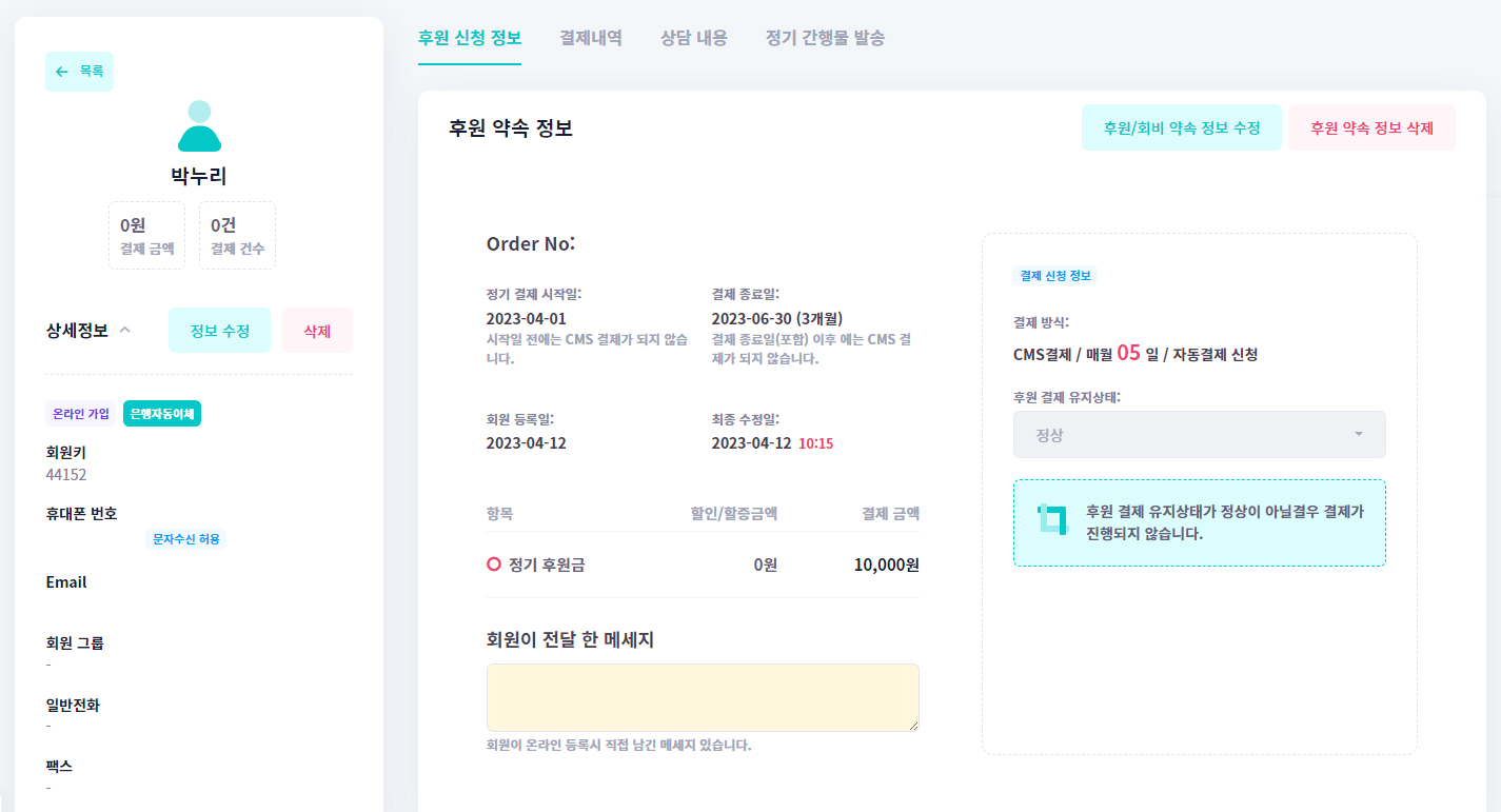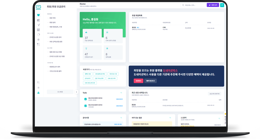 다양한 회원관리 CRM 기능을 활용햐여 후원자 관리를 체계적으로 운영할 수 있습니다.