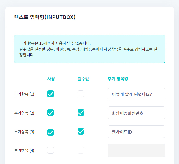 내가 정의하는 회원 등록 정보를 필수값으로 선택하여 정확하게 회원등록 정보를 받을 수 있습니다.
