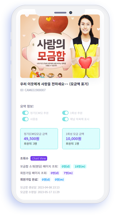 온라인 모금함 접속자, 모금액, 후원자 등록 등을 차트로 확인할 수 있습니다.