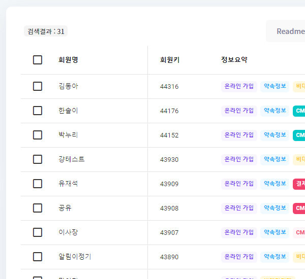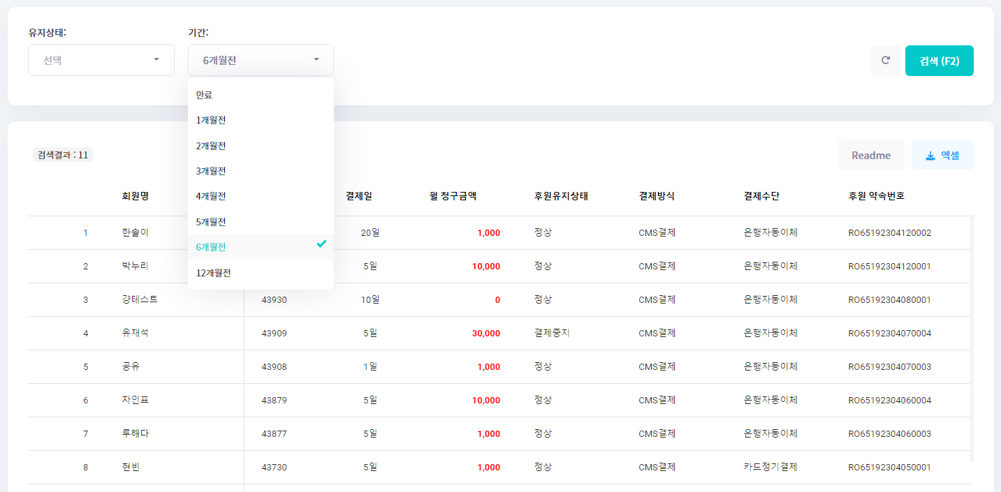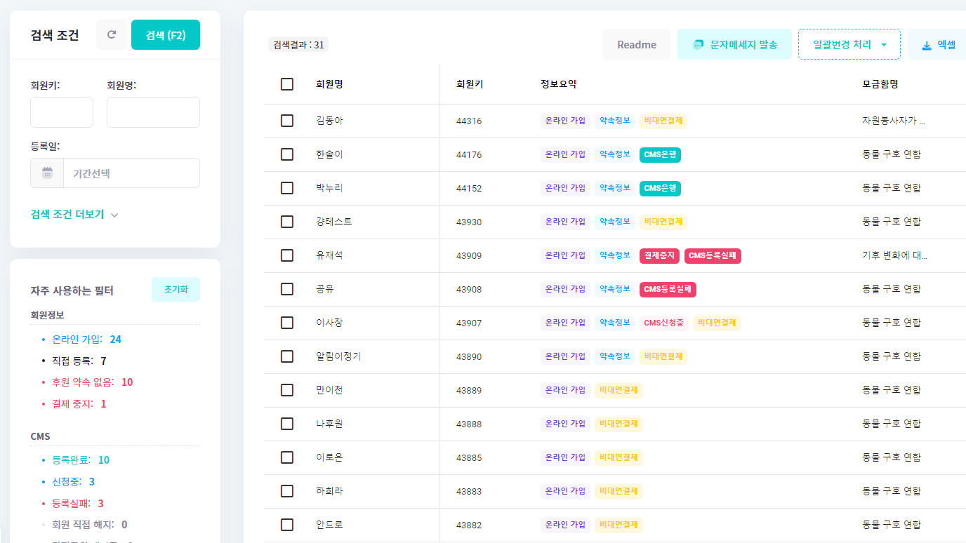 회원의 상태를 쉽게 판단할 수 있도록 CMS 등록 상태, 후원 약속 상태, 결제 수단 종류 등 다양한 정보를 요약하여 회원 목록에 표시합니다.